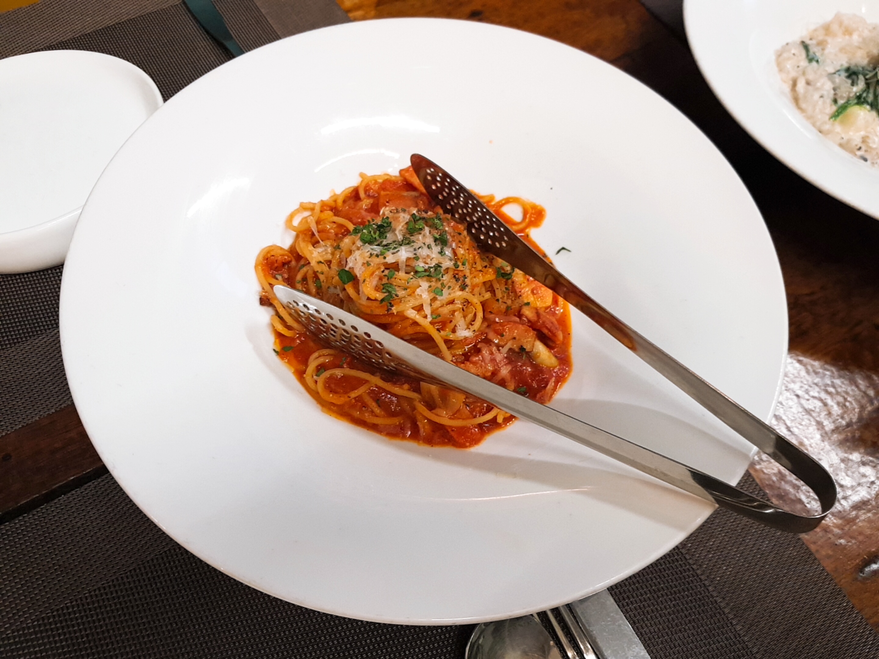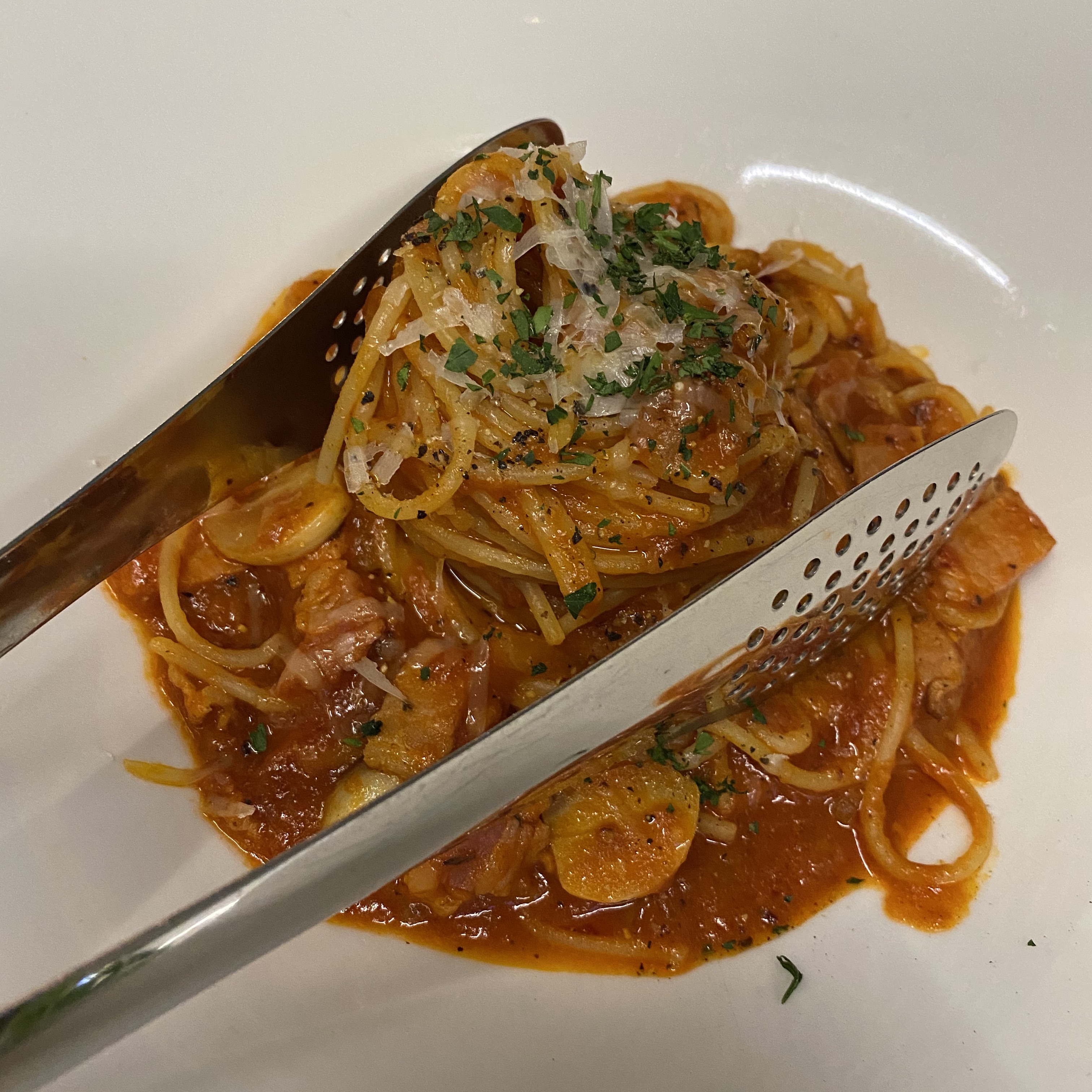 베이컨을 곁들인 매콤한 토마토 소스 파스타.